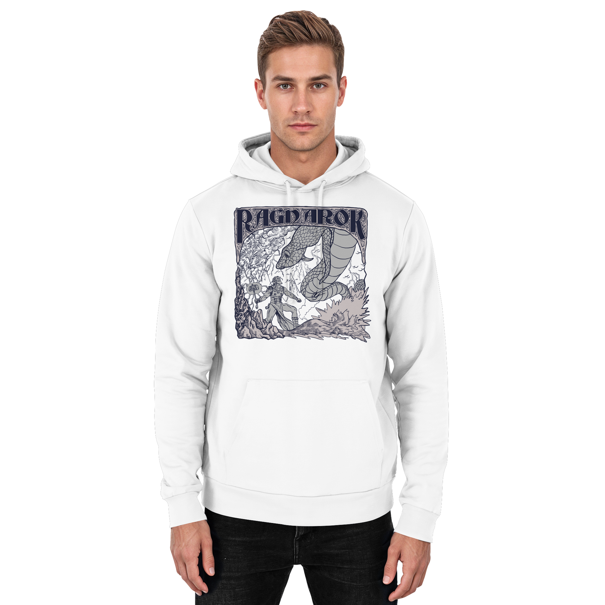 Die Midgardschlange wird auch Weltenschlange genannt, weil sie sich in ihren eigenen Schwanz beißt (und damit die Form eines geschlossenen Kreises bildet). Wenn sie ihren Schwanz loslässt, beginnt der Weltenbrand, Ragnarök. Dabei trifft Thor zum dritten und letzten Mal auf die Schlange, die den Ozean verlässt, um den Himmel zu vergiften. Er erschlägt sie mit Mjölnir, seinem Hammer, kann aber nur neun Schritte zurückweichen, bevor er an ihrem Gift stirbt. Ein tolles Motiv für alle Wikinger Fans und Anhänger der nordischen Mythologie.